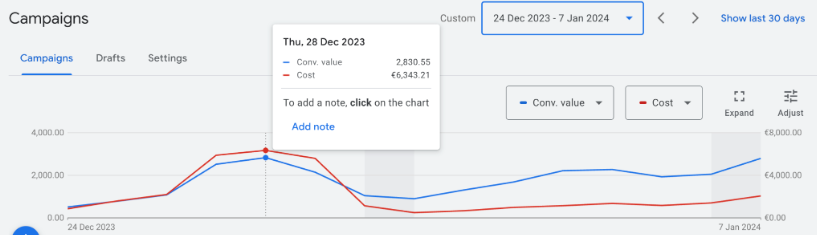 Don’t use ‘maximize clicks’ without total budgets and max CPC budgets. One freelancer in our team wanted to ‘get the data going’ with Maximize clicks so around Christmas (the one time I don’t check the data for a few days), we’ve made calculated losses of around €15k versus what we’d normally earn with this move. When you give Google the opportunity to spend a lot of money, they will grab that opportunity. Be frugal. Be careful.